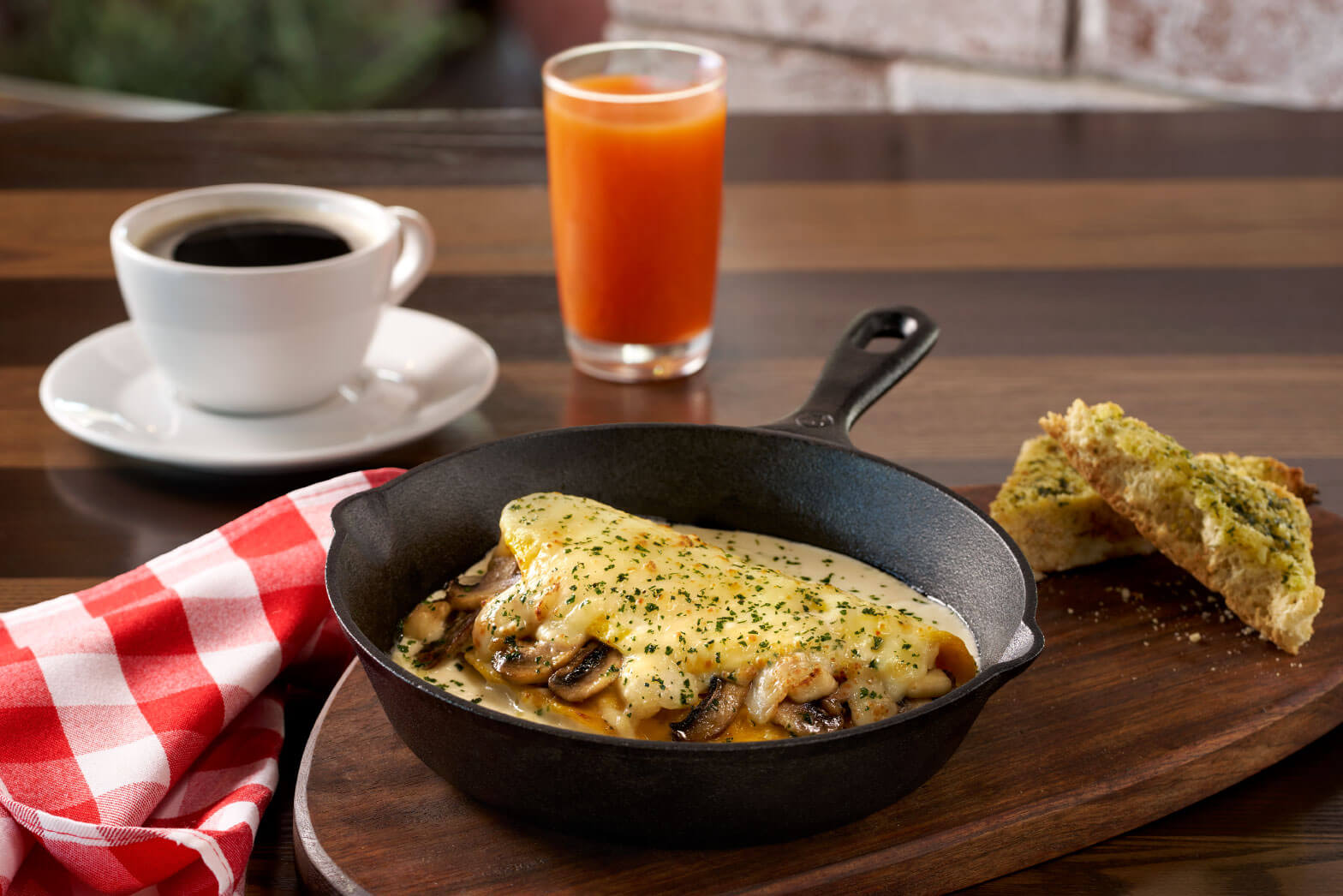 Huevos revueltos con calabazas y tocino (28 g) con un toque de chipotle, gratinados con queso Mozzarella y rebanadas de pan toscano, servidos sobre nuestra tradicional salsa Alfredo y Pesto.